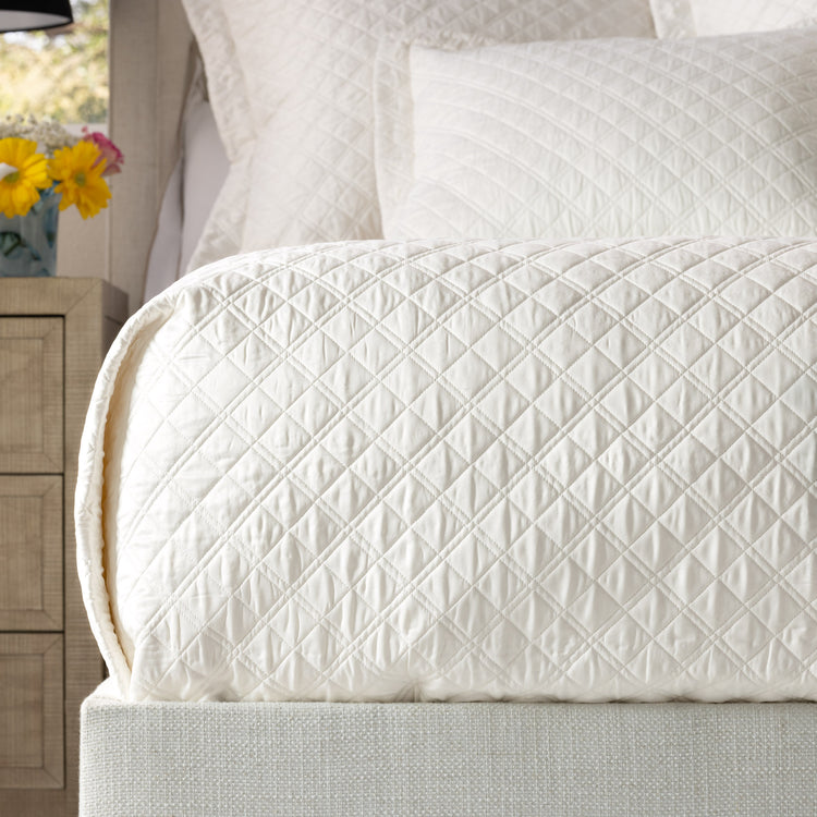 The Silk & Sensibility Ivory King Coverlet is a popular choice for anyone seeking the luxury and elegance of silk without the delicacy of the fabric. Features a classic diamond quilting pattern across its face and a basic 1” flange along its border. All of our diamond-quilted Silk & Sensibility bedding is machine washable for years of enjoyment.