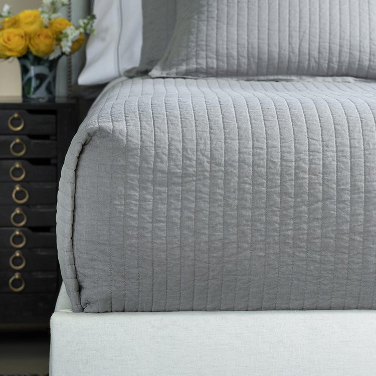 Casual and relaxed. Our Tessa Light Grey King Quilted Coverlet in linen offers luxurious comfort and understated elegance. Channel quilting is clean and transitional. Pre-washed and pre-shrunk, this linen is a welcome addition you will enjoy for years.